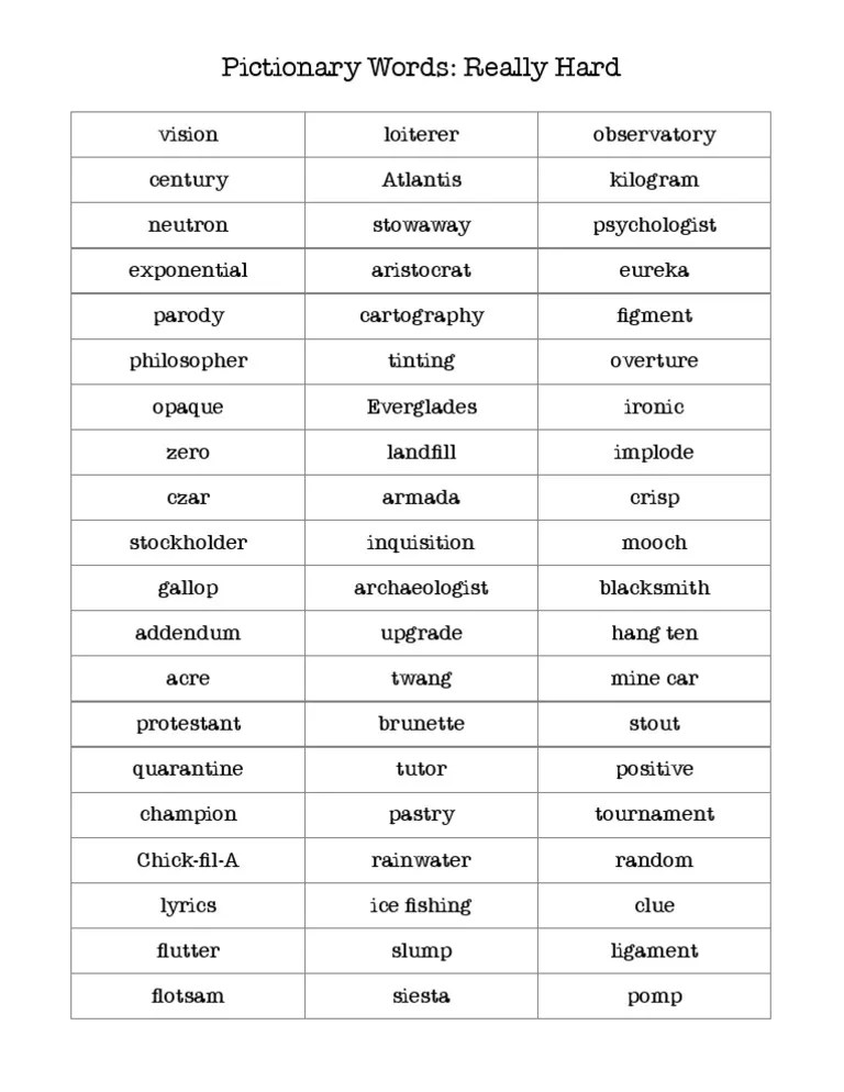 Web pictionary word lists. Web this list includes hard, medium, funny and easy pictionary words for kids, so you can choose according to your child’s level of. A pen, paper, and a list of words. Grab your free printable christmas pictionary game cards. You just need to scrounge up that pen and paper (and your creative side).